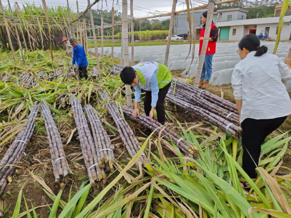 抵达现场后,黄埔助农小分队没有片刻寒暄,直接扎进泥泞的蔗田。面对蔗农因成本倒挂而无力请人砍收的困境,黄埔工作队化身“农工”,与当地村民并肩作战,挥刀砍蔗、削叶捆扎、装车搬运。仅仅半天,一辆辆满载着乌黑发亮、清甜多汁果蔗的货车就已经整装待发。