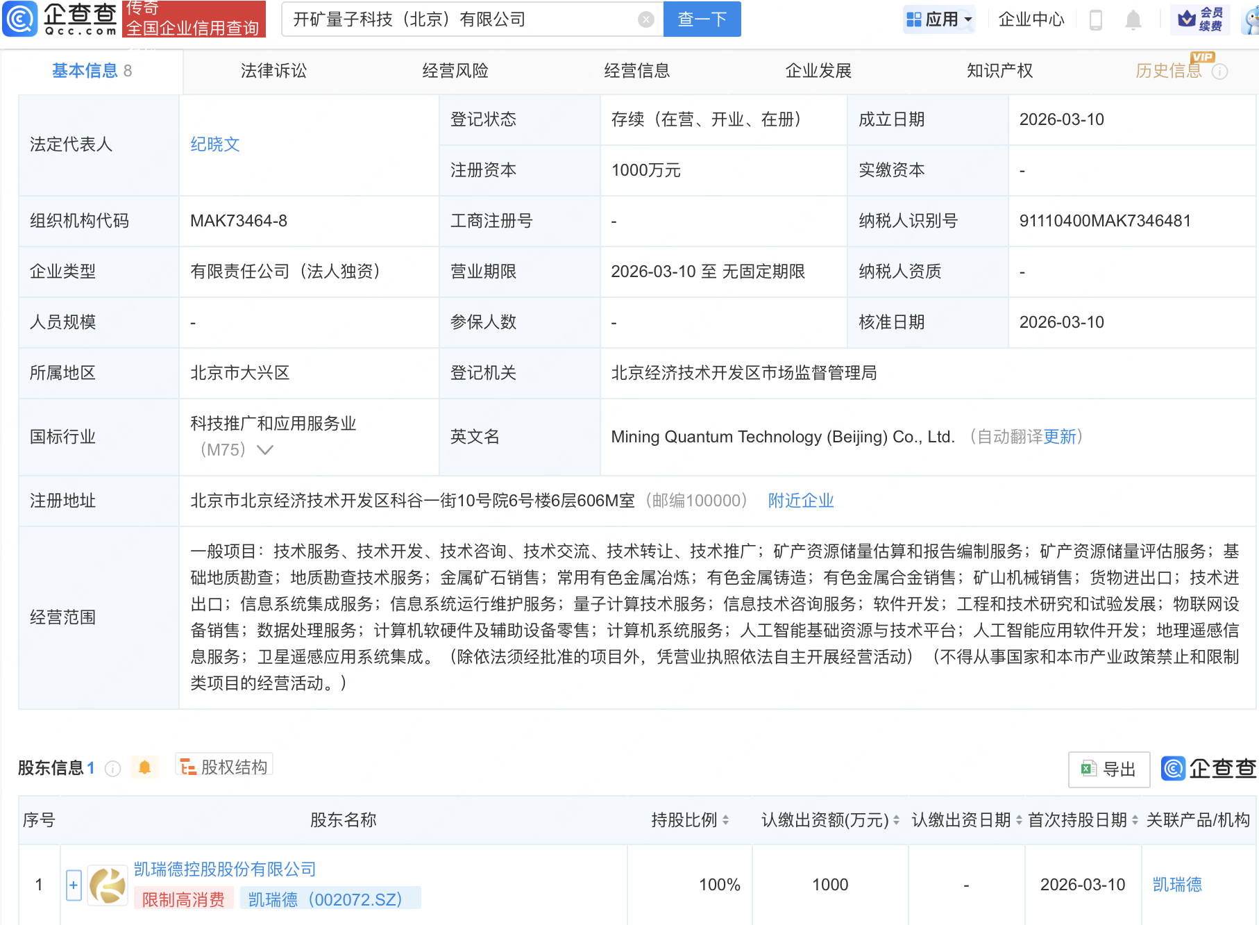 近日,开天芯源量子科技(北京)有限公司、开矿量子科技(北京)有限公司成立,经营范围包含:人工智能基础资源与技术平台;人工智能应用软件开发等。企查查股权穿透显示,二者皆由凯瑞德(002072)全资持股。